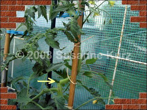 Wie gesagt, die Spitze wird wohl noch ausreichend versorgt, doch wenn die Pflanze oberhalb der Bruchstelle Früchte ansetzt, wird es mit der Statik schwierig und spätestens dann droht der Rest des Stammes abzubrechen.